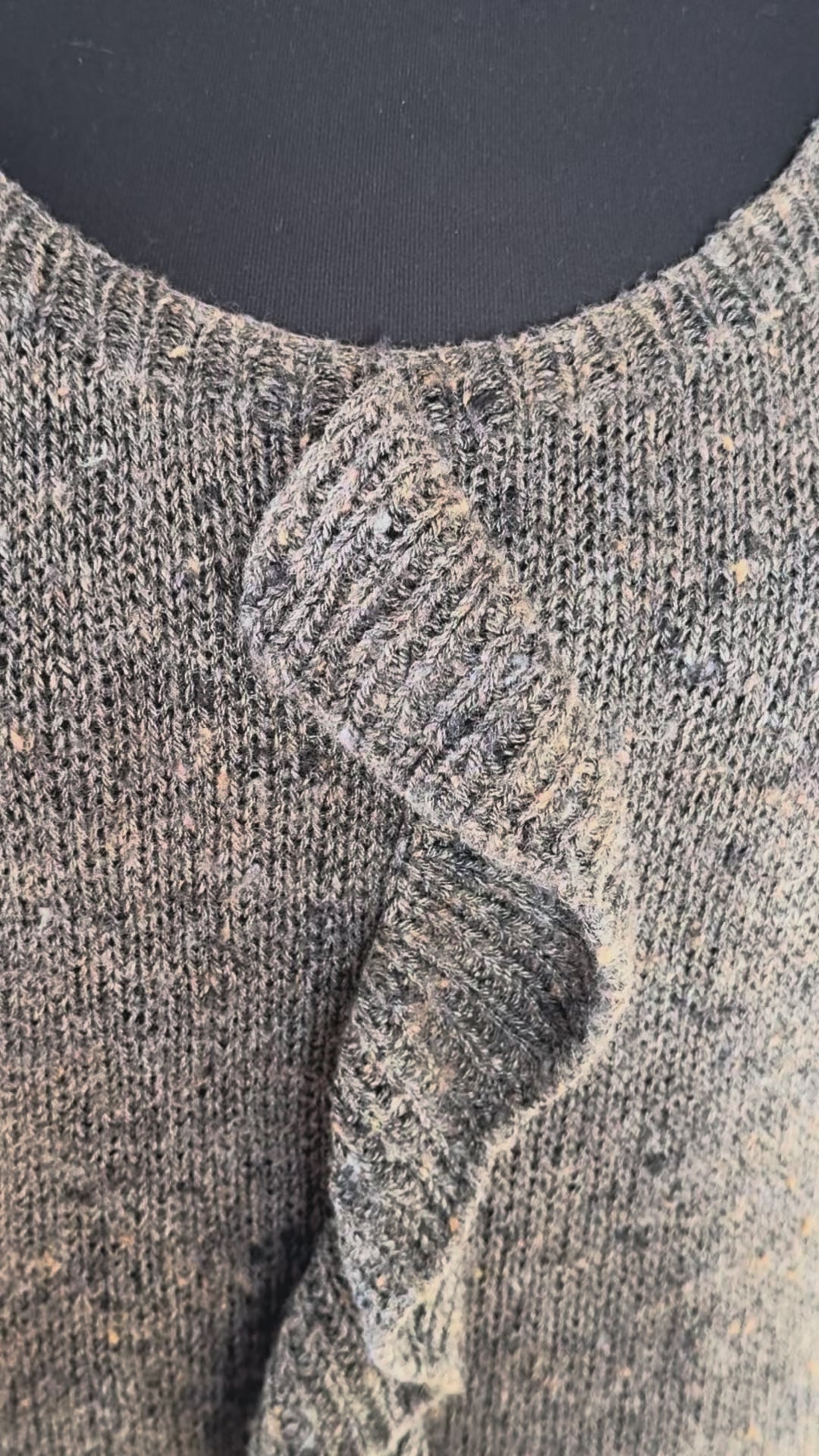 Nadeln: 3,5 mm / US 4 80 cm / 32" für Bündchen (Ärmel / Saumbündchen), 4,0 mm / US 6 in 80 cm / 32" für Körper, Ärmel und den Volant. Oder die Stärke, mit der du die Maschenprobe erreichst.
